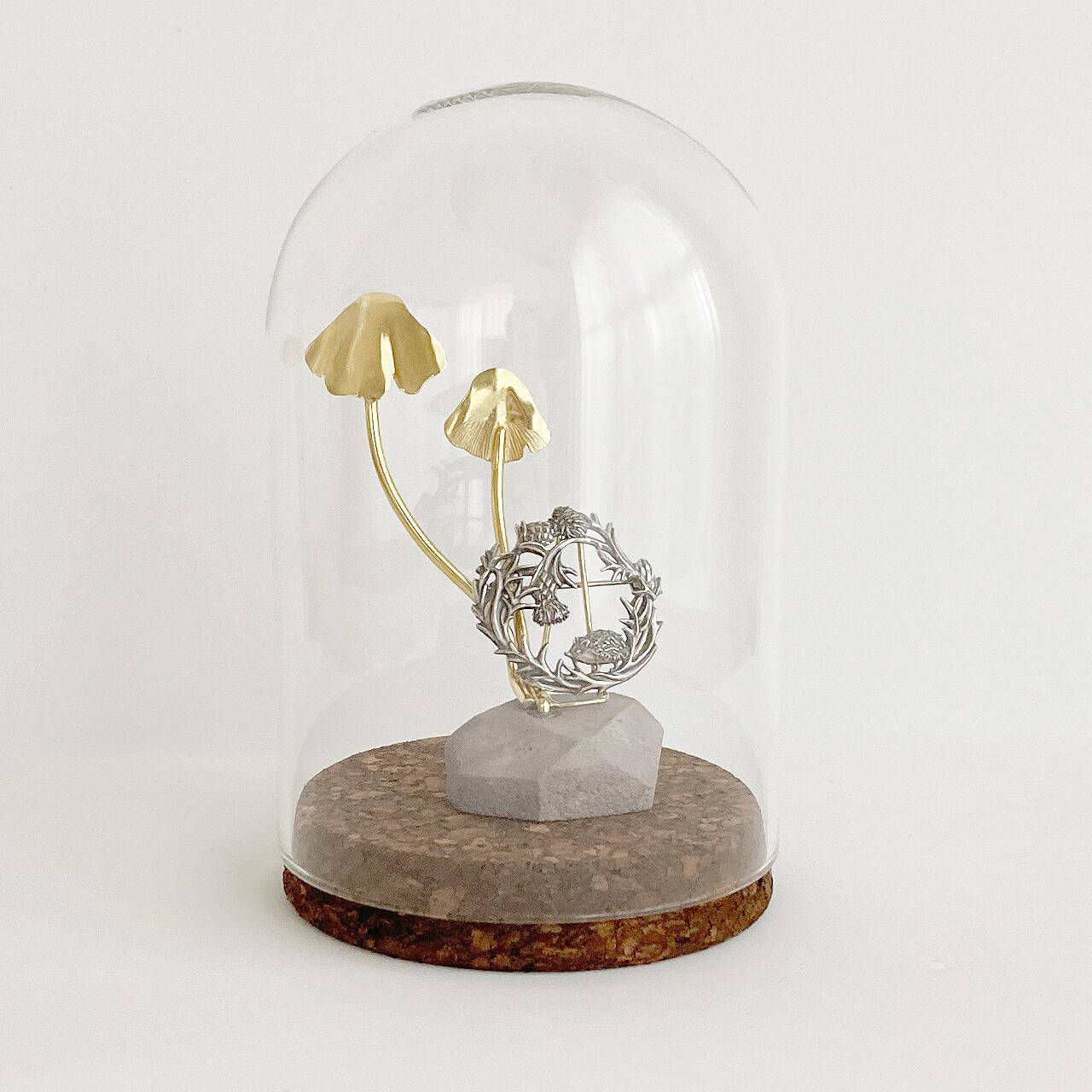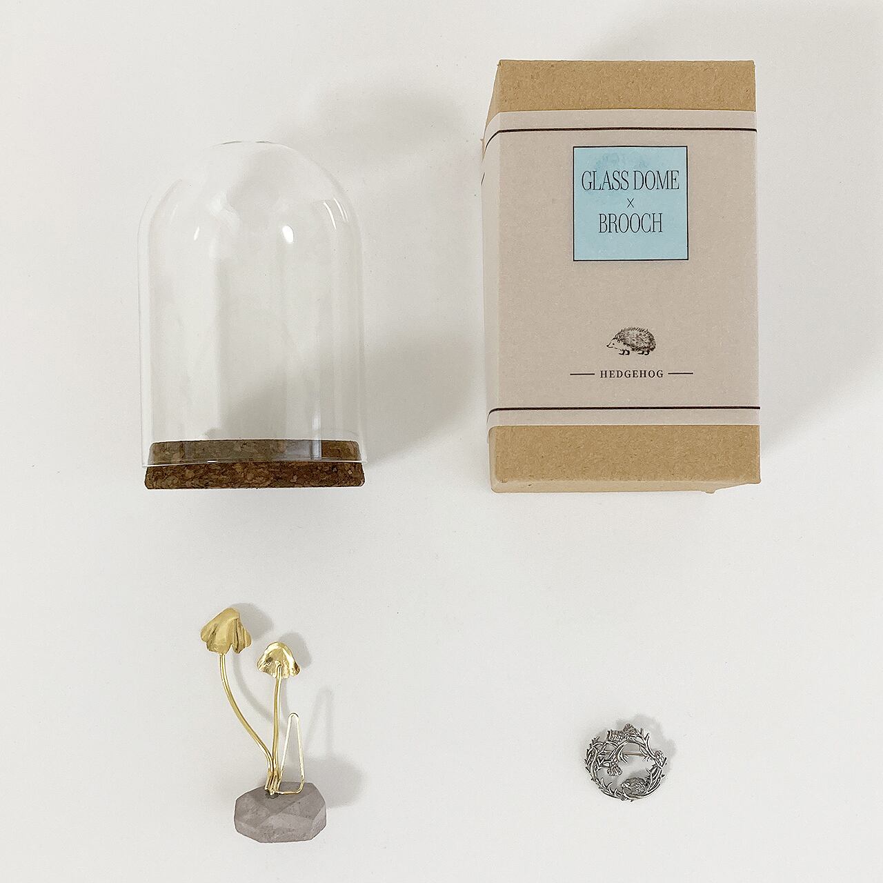童話のような世界観とクラシックなデザインのブローチをドーム状のガラスに閉じ込めました。中のブローチはマフラーやトートバックのワンポイントとしても着けられ、装身具として使わない時にはメタル土台にセットしてインテリアとしてもお楽しみいただけます。
