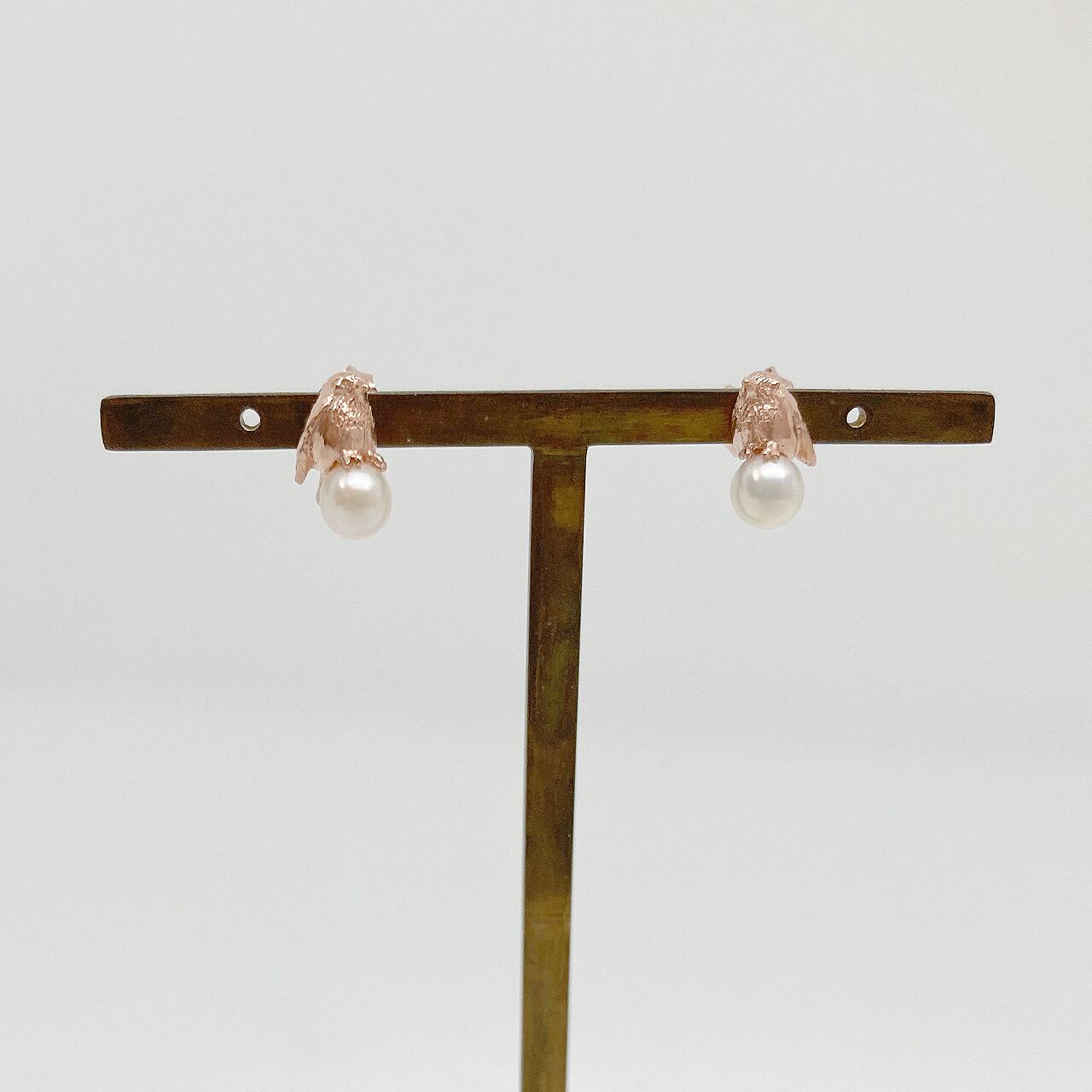 クリスマスの飾りやカードに描かれることが多いコマドリ(robin)がパールの上にちょこんと止まっているピアスです。雪玉の上で寒さをしのぐために羽毛を膨らませて丸くなっている姿を連想させます。肌なじみの良いピンクゴールドと淡水パールの優しい輝きが大人かわいい仕上がりです。