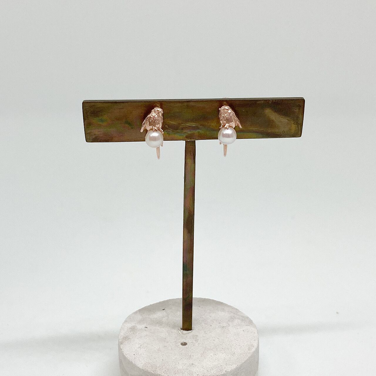 クリスマスの飾りやカードに描かれることが多いコマドリ(robin)がパールの上にちょこんと止まっているイヤリングです。雪玉の上で寒さをしのぐために羽毛を膨らませて丸くなっている姿を連想させます。肌なじみの良いピンクゴールドと淡水パールの優しい輝きが大人かわいい仕上がりです。シリコン製のゴムカバーがついているのでフィット感が良く、長時間着けていても痛くなりにくいです。内部のバネ部分のみ地金の色(銀色)です。ご了承ください。