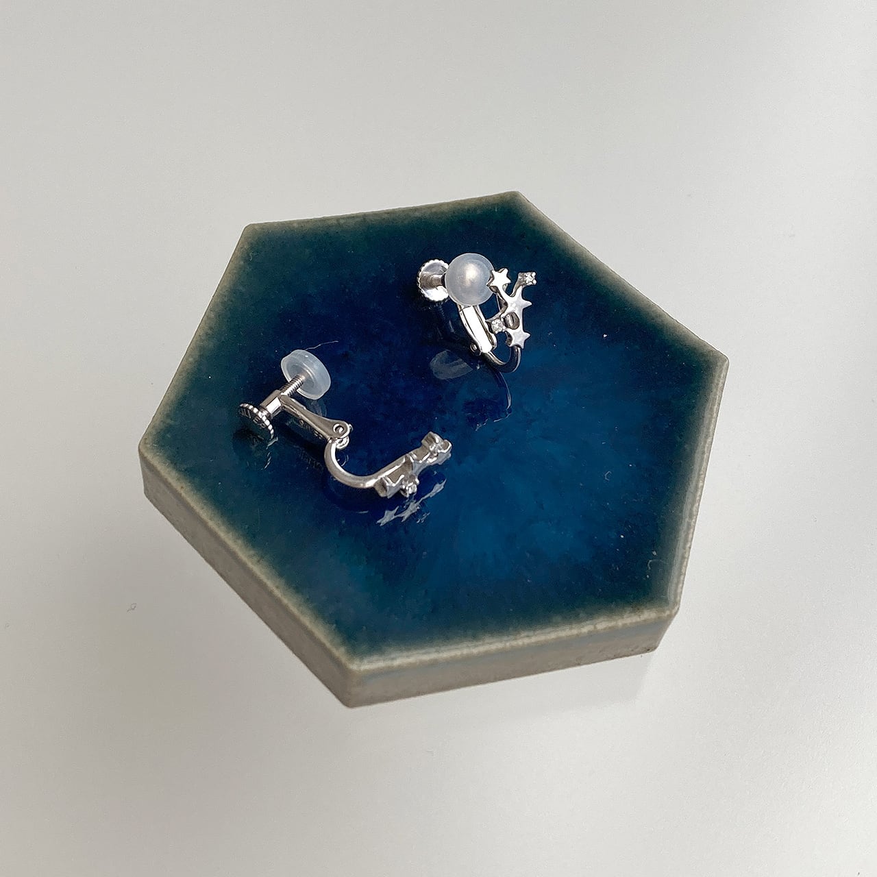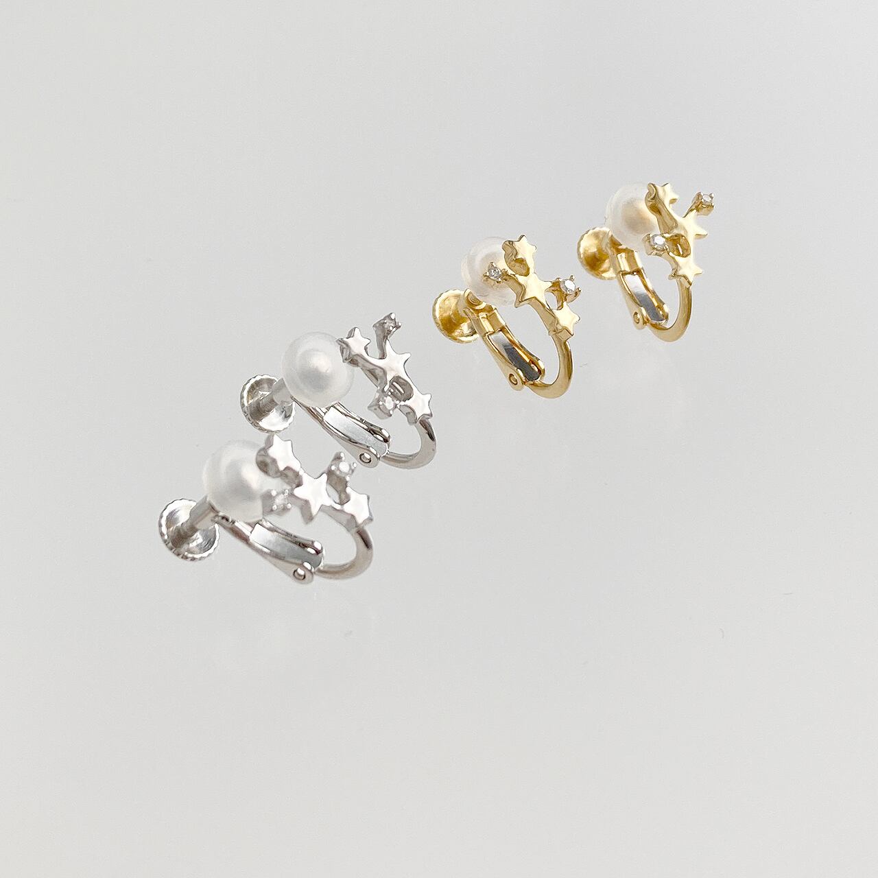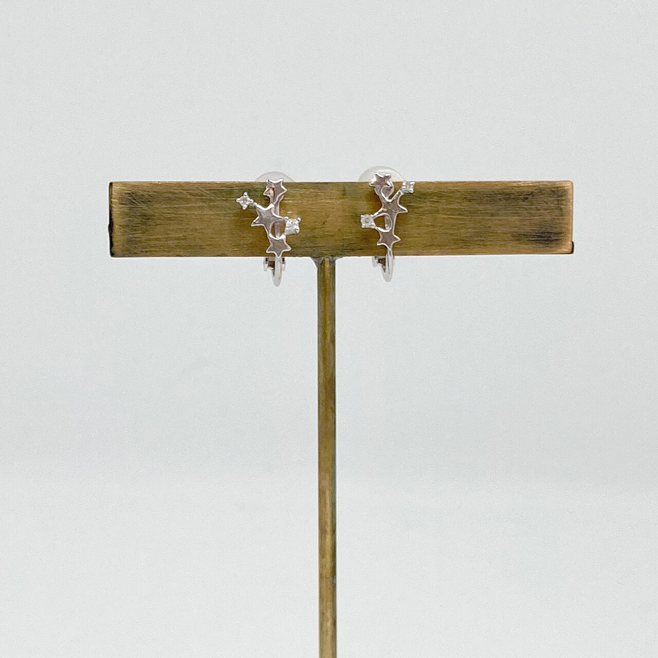 丸みを帯びた星の優しい輝きとメレダイアモンドのキラキラしたシャープな輝きのコンビネーションが夜空に広がる星々を彷彿とさせます。耳たぶに収まる小さいサイズなのでオンでもオフでもご利用いただけます。始めたシリコン製のゴムカバーがついているのでフィット感が良く、長時間着けていても痛くなりにくいです。内部のバネ部分のみ地金の色(銀色)です。ご了承ください。