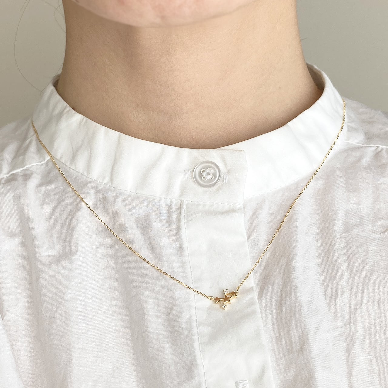 丸みを帯びた星の優しい輝きとメレダイアモンドのキラキラしたシャープな輝きのコンビネーションが夜空に広がる星々を彷彿とさせます。華奢なチェーンに下がるチャームは遠くに見える流れ星のようです。アジャスターのエンドには小粒のブルームーンストーンが付いています。