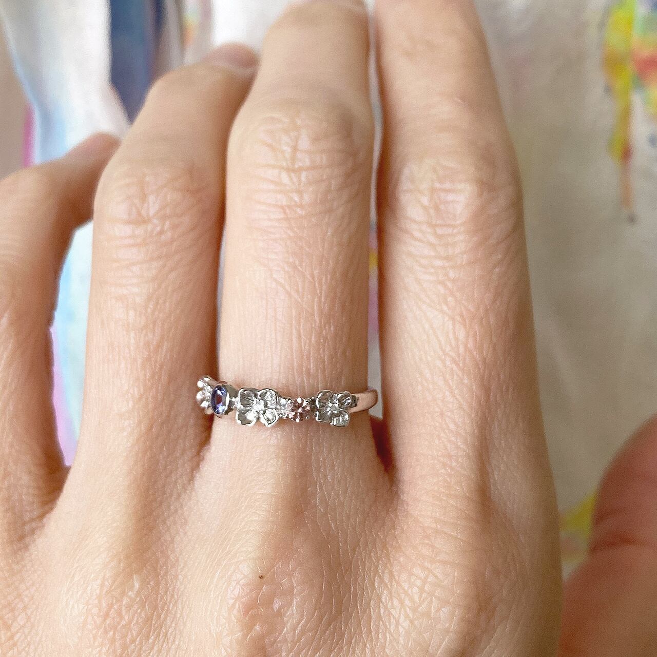 小花の中心のメレダイアモンド、青みを帯びた紫色のアイオライト、ダスティピンク色のシャンパンガーネットが光の帯を作り出し指先を華やかに彩ります。また、プラチナコーティングが朝露が降りたように花冠全体をみずみずしくまとめ上げています。