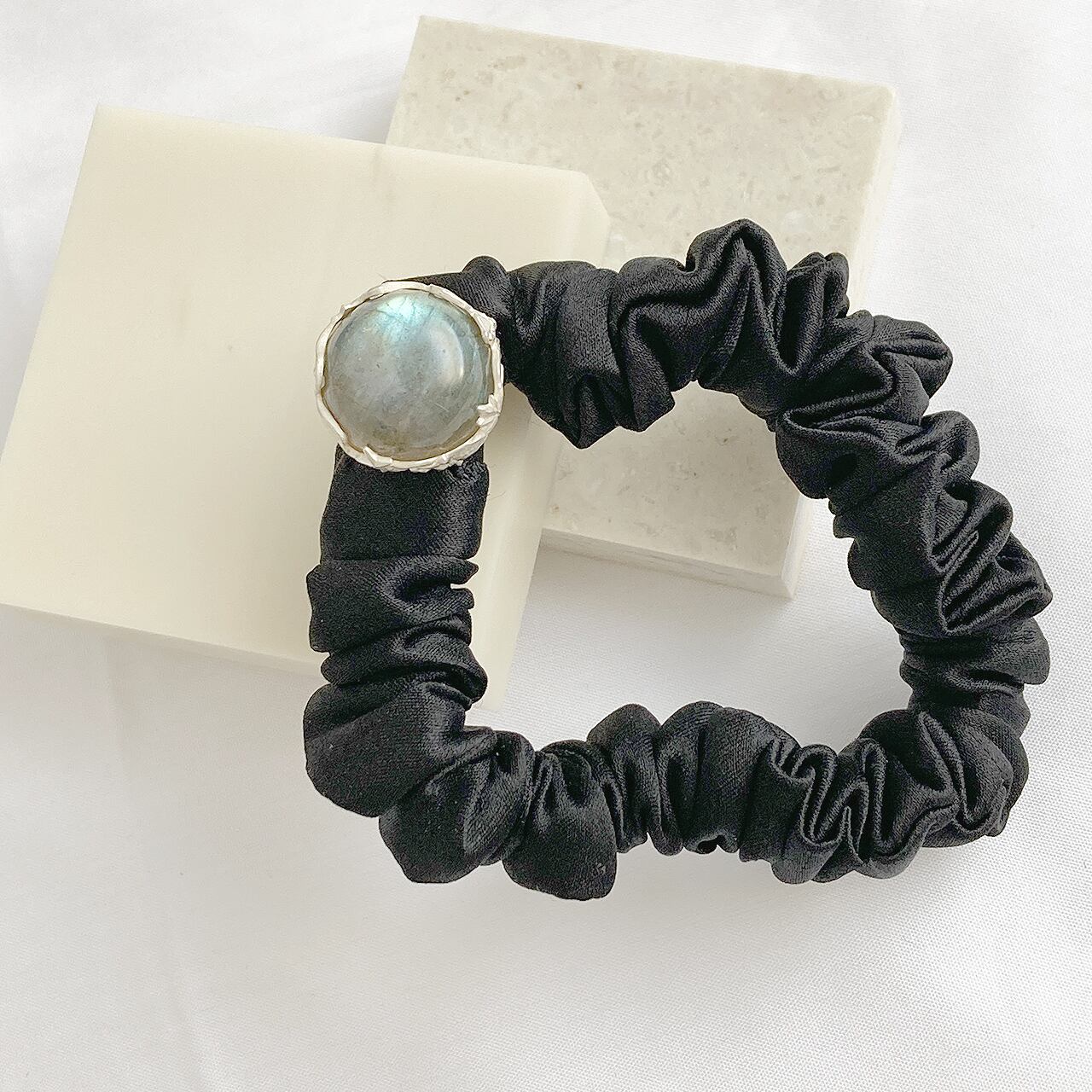 オーロラの雪原を進むシロクマの親子が絵巻物のように表現されたシュシュポニーです。ラブラドライトの虹色の輝きが幻想的な夜空のオーロラを思わせます。小さいながらも親熊の骨太な感じと子熊のコロンと丸みを帯びた体格のコントラストがよく出ています。ヘアアクセサリーとしてのご使用はもちろん、ブレスレットとしてもコーデのアクセントにおすすめです。チャームは取り外し可能なのでスカーフチャームとしても使用できます。付属のシュシュはシルク製で髪と肌に優しく美しい光沢が特徴です。手洗いで洗うことが出来、ゴムの交換も可能なので快適に使い続けられます。(シュシュのみの買い替えも可能です。)北欧デザインがお好きな方や冬生まれの方に向けたギフトにぴったりです。