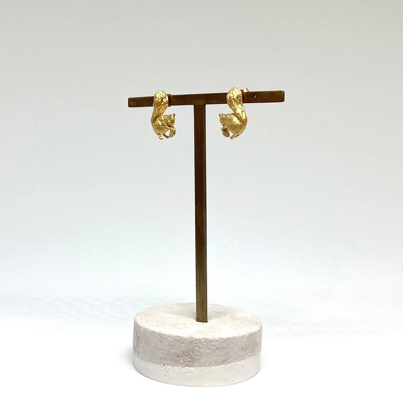 耳を澄ますと枝から離れた葉っぱが折り重なる音が聞こえてくる森の中動物たちは冬支度に大忙し。中でもせっかちなリスは縦横無尽に森を駆け巡り、お目当てのドングリを集めます。耳元のリスはつける人に何と囁いているのでしょうか。小ぶりなサイズで肌なじみのよいマットゴールド仕上げのピアスです。立体感は残しながら装着した時のフィット感を出すために一部だけ平らにしてあります。お気に入りの装いからデニムまでシーンを選ばないデイリーユースなデザインです。