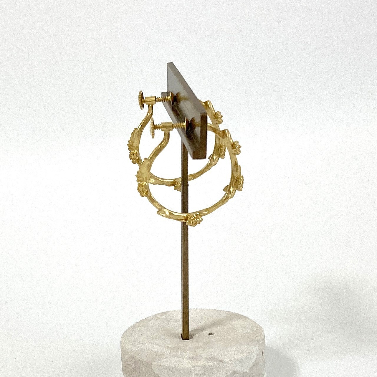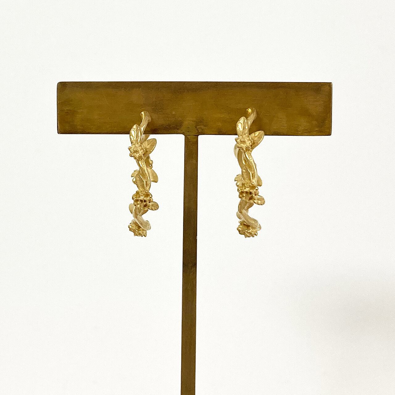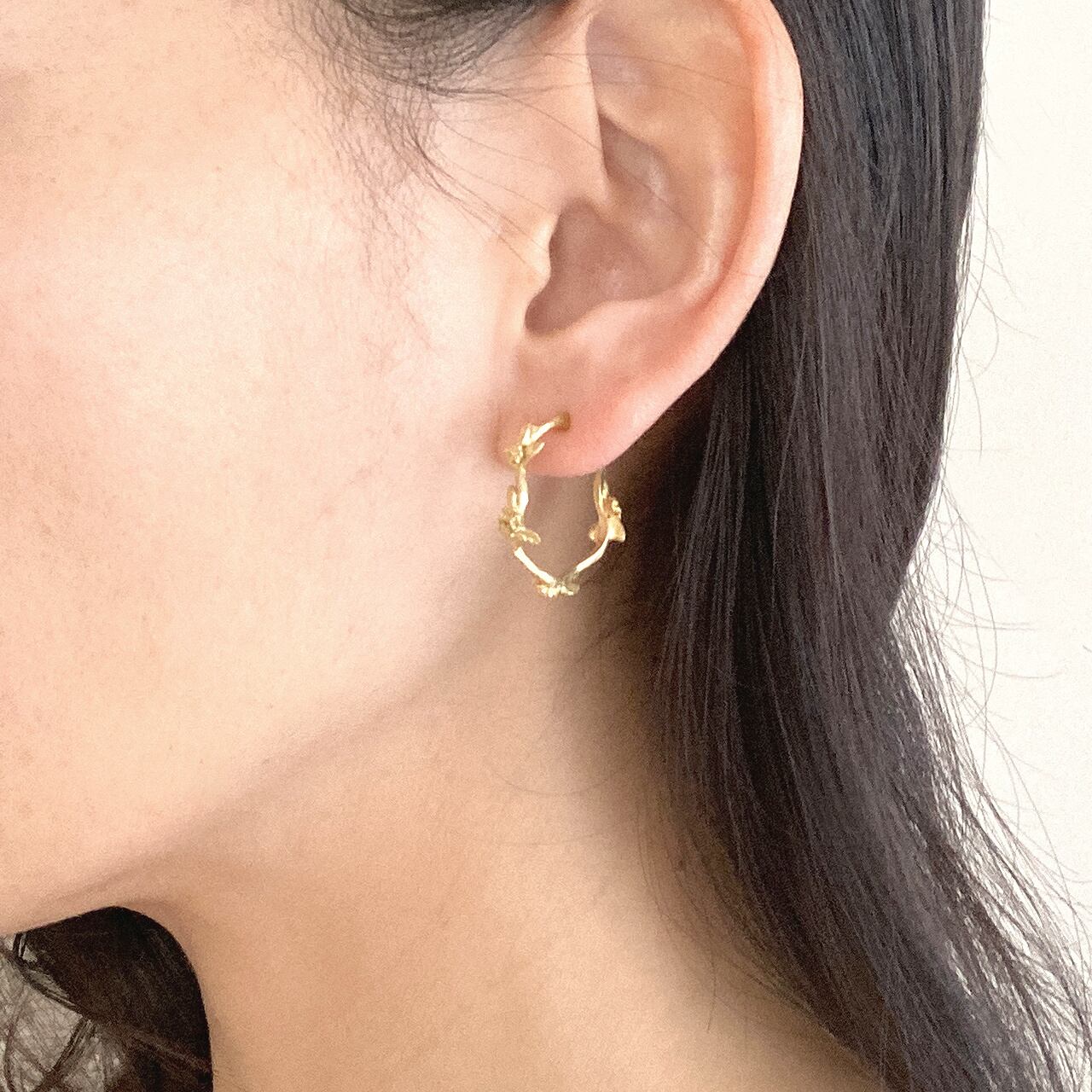 小さな可愛らしい花をたくさん携えて蔓を伸ばすモッコウバラをイヤリングにしました。蔓のあふれる生命力と淡い黄色の花を目にすると春が来た喜びを感じます。フープ全体が波打った動きのあるデザインなのでシンプルなコーディネートのアクセントになります。