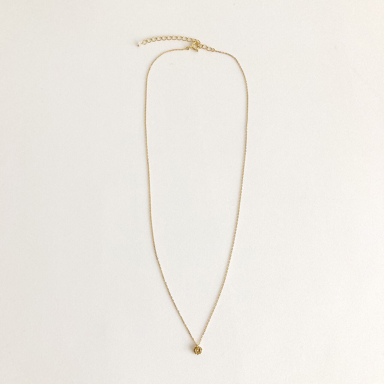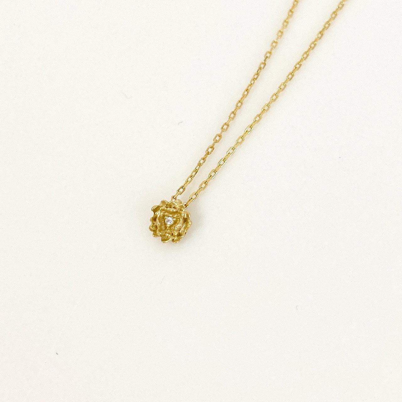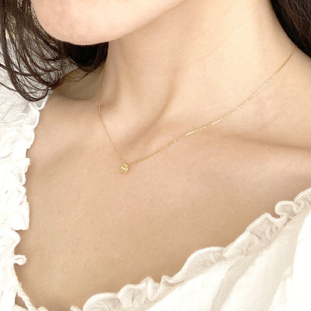 小さな可愛らしい花を一気に咲かせ春が来た喜びと高揚感をくれるモッコウバラを小さなペンダントにしました。モッコウバラのレモンイエローを思わせる淡いゴールドとアジャスターエンドにはポイントにブルームーンストーンを使用した仕上げになっています。上品な小さいサイズなのでオフィスファッションから日常までお使いいただけます。