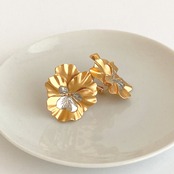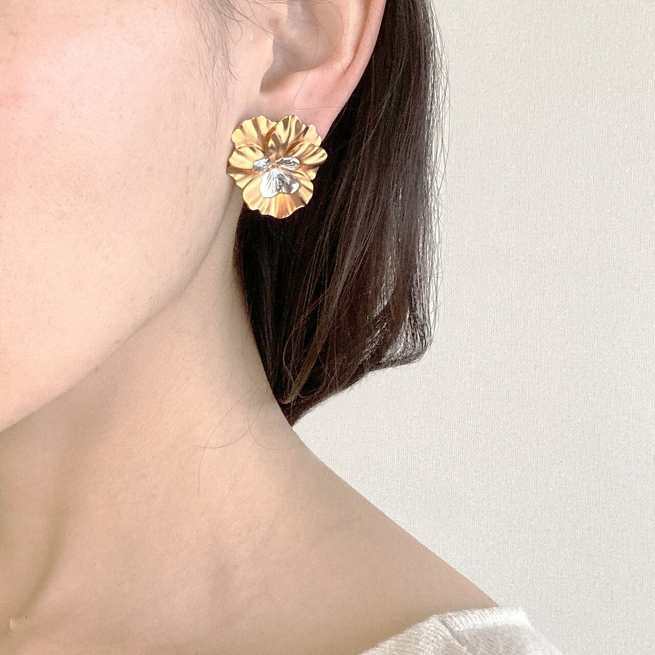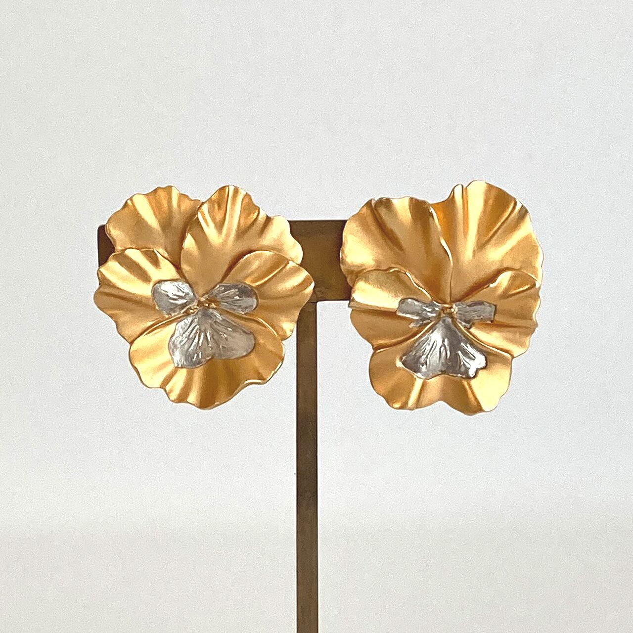 品種やカラーが豊富なパンジーの中でも華やかで気品漂うフリルパンジーをイヤリングにしました。波打つ花びらが光を乱反射させて奥深い立体感と輝きをもたらします。ゴールドの部分は白仕上げ(ハーフマット)なのでギラギラせずろうそくの灯がともったようなやさしい輝きです。