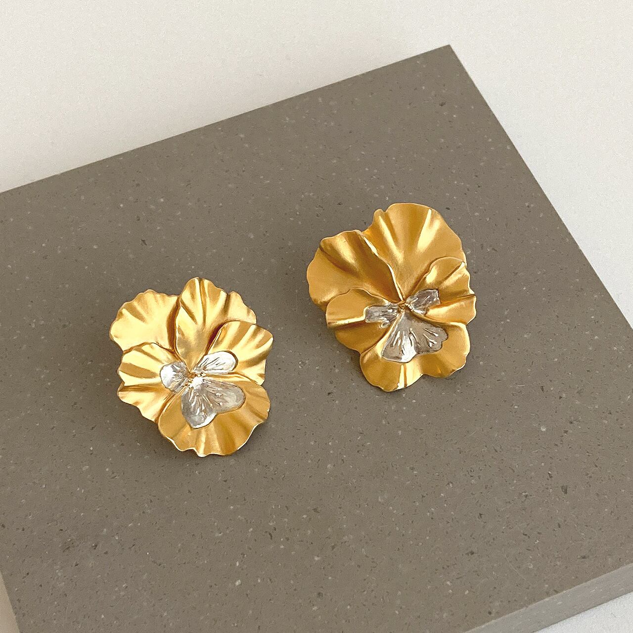 品種やカラーが豊富なパンジーの中でも華やかで気品漂うフリルパンジーをピアスにしました。波打つ花びらが光を乱反射させて奥深い立体感と輝きをもたらします。ゴールドの部分は白仕上げ(ハーフマット)なのでギラギラせずろうそくの灯がともったようなやさしい輝きです。