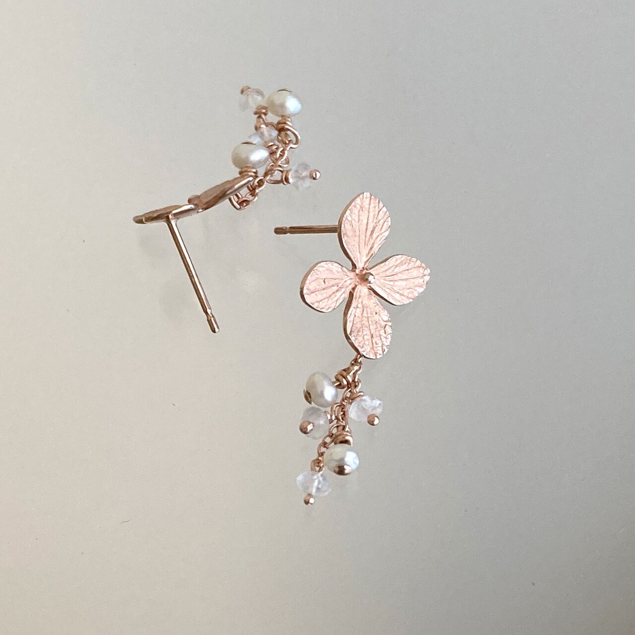1個づつ本物のアジサイの花から型取りして製作しているので世界に2つと無い形です。大地を潤す雨が降った後、音もなく花弁を雨粒が転がって輝く情景を思わせる梅雨の時期も前向きにさせてくれるピアスです。お花の部分はピンクゴールドカラーのハーフマット仕上げなのでふんわり肌なじみの良いやさしい輝きです。