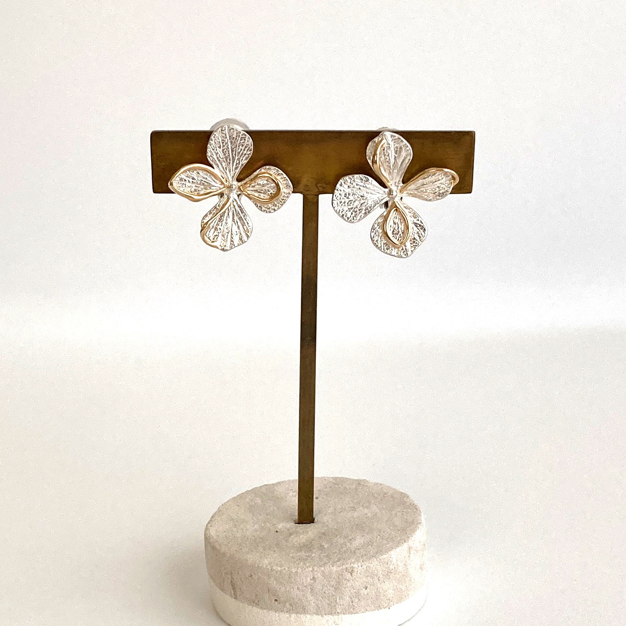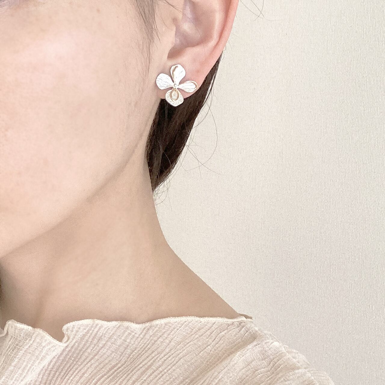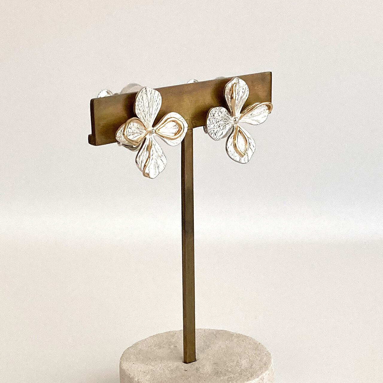 1個づつ本物のアジサイから型取りしているお花部分とアクセントのゴールドメタルのコントラストが美しいスタッズタイプのイヤリングです。ナチュラルさとモード感が程よくミックスされているのでデニムからオフィススタイルまで幅広いシーンでお使いいただけます。気分がふさぎがちな梅雨でもシルバーのアジサイが顔周りを明るく照らします。シリコンキャッチつきなので長時間着けていても痛くなりにくく安定したフィット感があります。