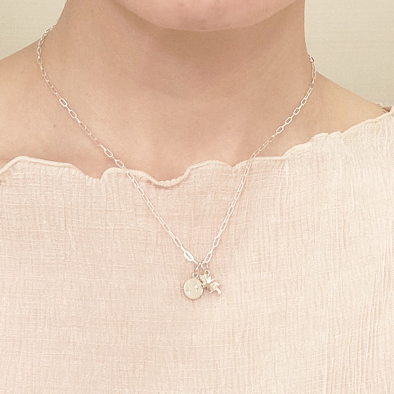 着脱可能なチャームなので2個着けでも1個着けでもまたはチェーンのみでもお楽しみいただけます。存在感がありつつ上品なシャープさを持ったシルバーチェーンはデニムなどカジュアルな装いにもマッチします。