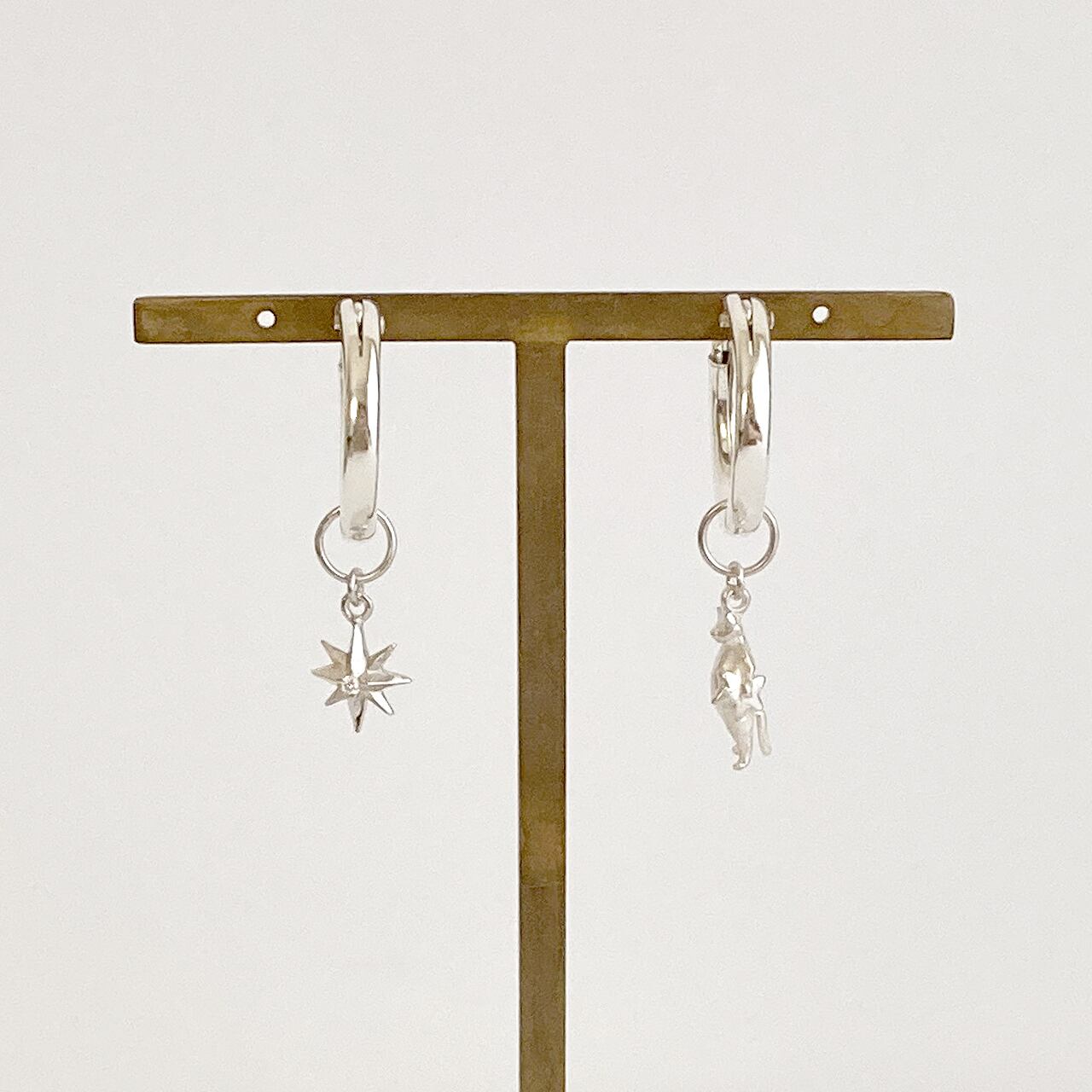 立体的に表現されたポッコリお腹がチャーミングな猫と中心にキュービックジルコニアが輝く星がセットになったアシンメトリーなデザインです。