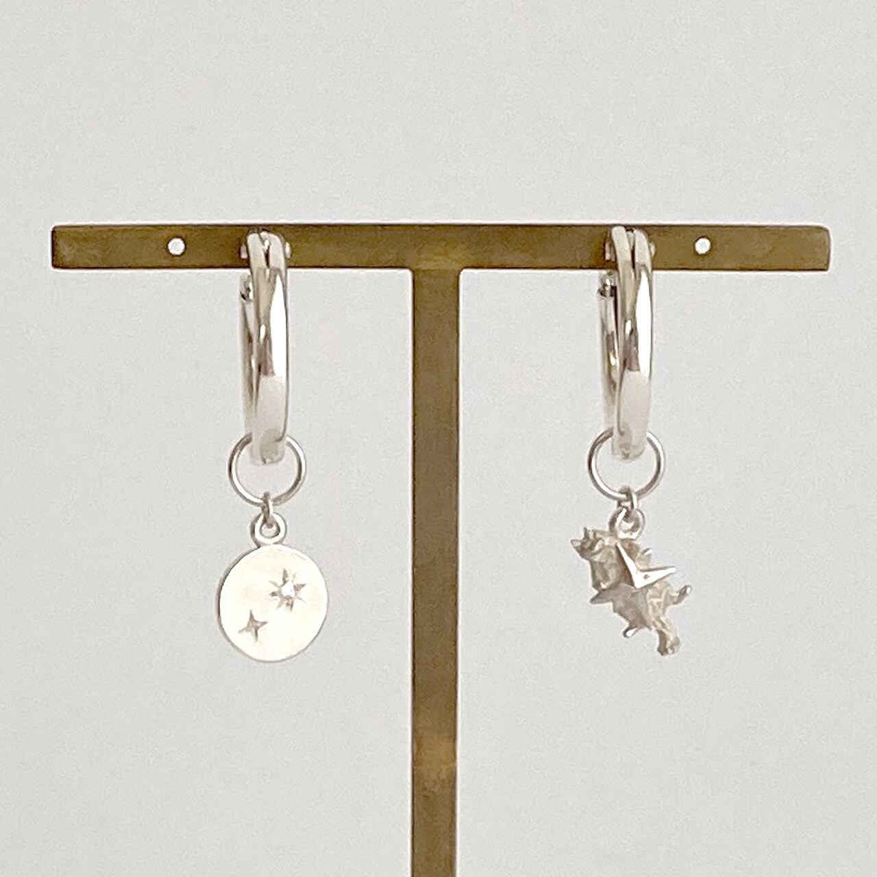 星をお腹に抱えて今にもケリケリしそうな猫と小さなキュービックジルコニアが輝くメダルがセットになったアシンメトリーなデザインです。